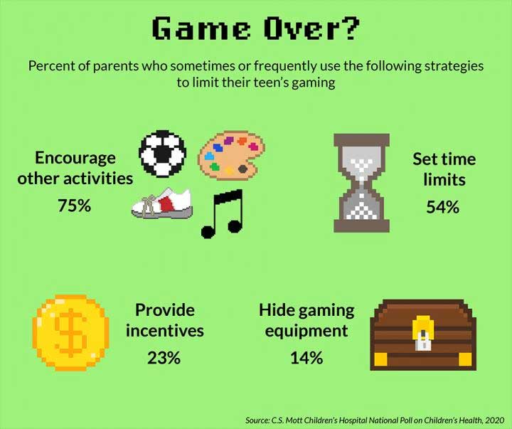 According to the poll, 71 percent of parents believe video games may have a positive impact on their teen. About 44 percent of parents try to restrict video game content. Parents of teens 13 to 15 years old are more likely to use rating systems to try and make sure games are appropriate for kids. The poll also showed that many parents use different strategies to try and limit the amount of time teens spend gaming, including encouraging other activities, setting time limits, providing incentives to limit gaming, and hiding gaming equipment.