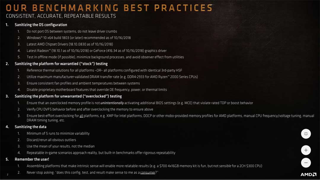 The chipmaker outlines steps for sanitizing the platform for stock warrantied testing and for unwarranted or overclocked testing. AMD also talks about sanitizing the data, specifically performing a minimum of five runs to reduce variability. AMD also wants people reading reviews and benchmark results to never stop asking “does this config, test, and result make sense to me as a consumer?” AMD’s slides are pictured here.