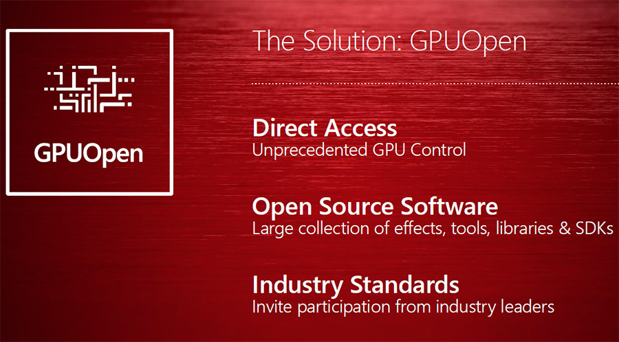 GPUOpen will give Game developers direct access to GPU hardware along with a large collection of open source effects, tools, libraries and SDKs. This is being done to allow game developers to get the maximum performance from the hardware and it should also help the sharing of knowledge and for better graphics innovation in games.