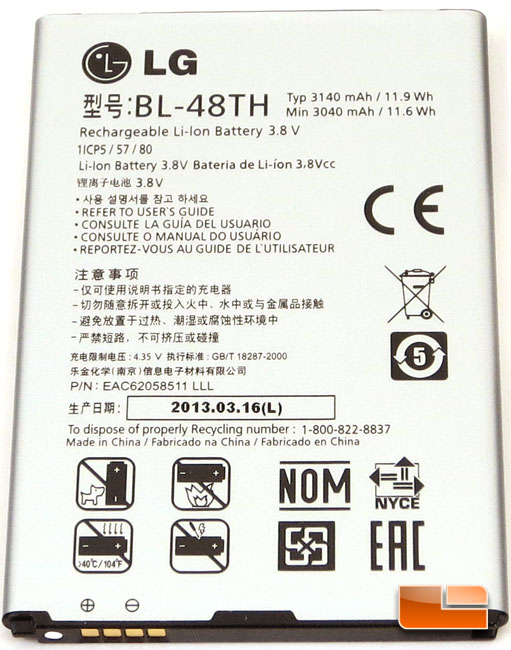 One of the biggest differences between the Optimus G and the Optimus G Pro is the ability to change the battery. In addition to needing a small Torx wrench to remove the back cover of the Optimus G, the battery is fastened down in the phone chassis with glue or double sided tape (didn’t want to risk damage by prying on it to hard). The Optimus G Pro is quite a bit different from that, and the battery easily pops out. The battery in the LG Optimus G Pro is a 3.8 Volt battery with a typical Amperage of 3140 mAH. If you’re in need of a replacement battery for the LG Optimus G Pro, you can search for BL-48TH and find them for ~$24.
