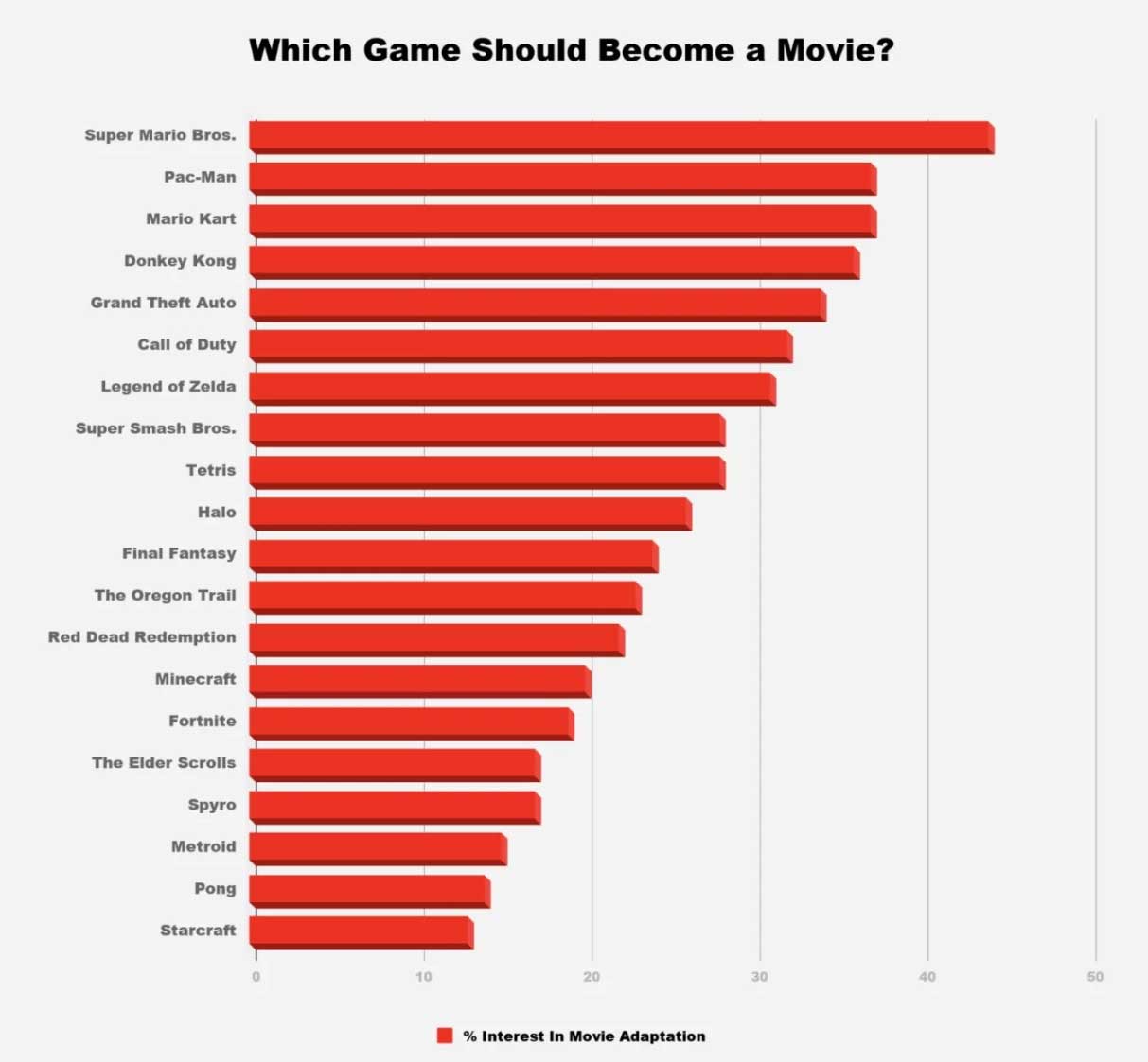 Rounding out the top five are Pac-Man, Mario Kart, Donkey Kong, and Grand Theft Auto. Some of the game franchises that would seemingly make the best movies are further down the list. Call of Duty was number six on the list, Halo was number 10, Final Fantasy was number 11, and Red Dead Redemption was number 13 reports NintendoLife.