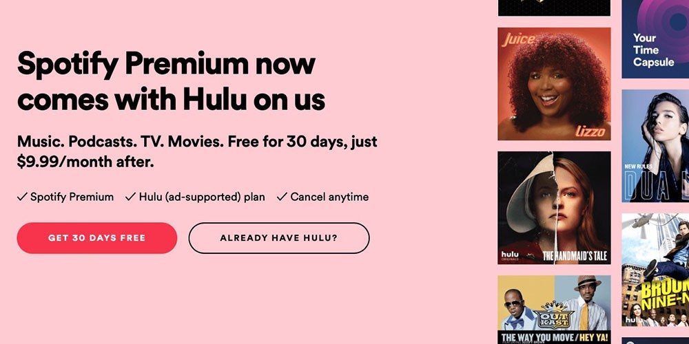 There are a couple of caveats to the deal. One, the free Hulu is ad-supported. The second is if you are a current or past subscriber to Spotify Premium you don’t get free Hulu.