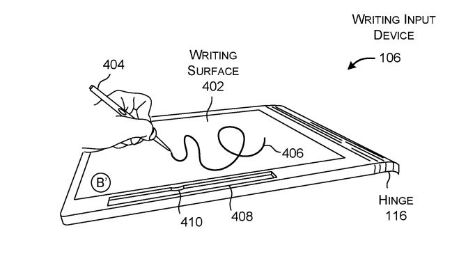 The rumor started with a patent filing that shows a notebook that looks similar to a Surface Book with a detachable keyboard. The model has beneath the keyboard a large writing surface that lets the user write notes or use it for drawing and sketching.