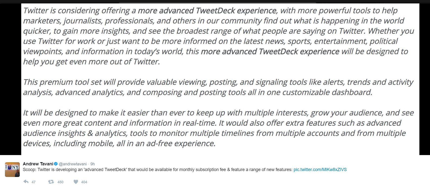 Similar to Twitter, TweetDeck is a free online tool which helps power users stay organized with their social media services when managing multiple accounts. The plan to expand TweetDeck further was revealed Thursday, the day the screenshots began to appear on Twitter. A message includes the subscription will make it easier than ever to keep up with multiple interests, grow your audience, and see even more great content and information in real-time.